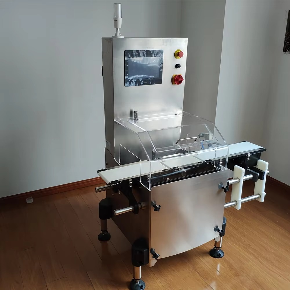 The checkweigher’s crevice-free 304 stainless steel construction supports daily cleanroom sanitization, while its food-grade white belt resists residue buildup. Key features: